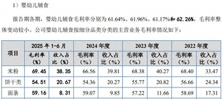 对此,招股书中也泄漏,英氏控股的中枢产物、收入孝顺约在80%的婴幼儿辅食,在2025年上半年的产物毛利率高达62.26%,权臣高于同时食物类同业业可比公司48.2%的平均毛利率,尽头是英氏婴幼儿米粉,毛利率高达近70%。
