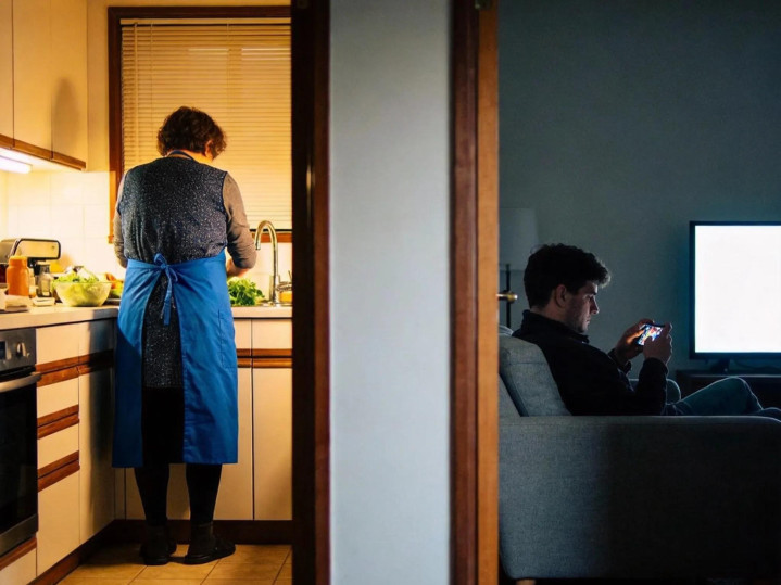又大概是多半个这么的平常:我作念饭、带娃、洗穿戴、指导功课;他放工、看手机、打游戏、寝息。