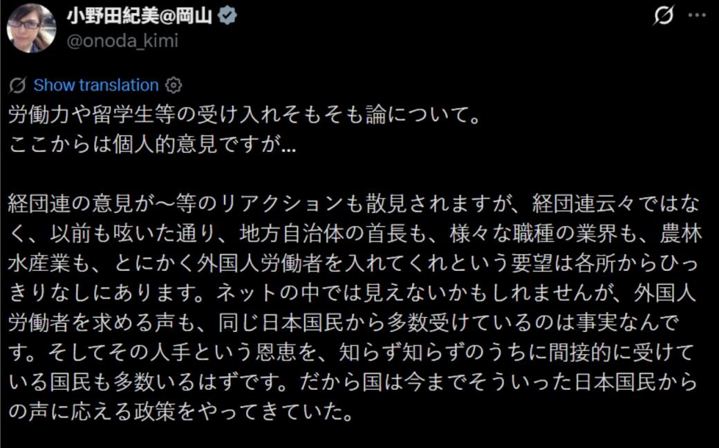 此前,为了迎合日本右翼民粹势力这个重要的“基本盘”,高市政府曾多次扬言要限制在日外国人的权利,推广“日本人优先”的政策,但小野田纪美却在她的帖文中表示,日本要想生存和发展,眼下还离不开外国人。