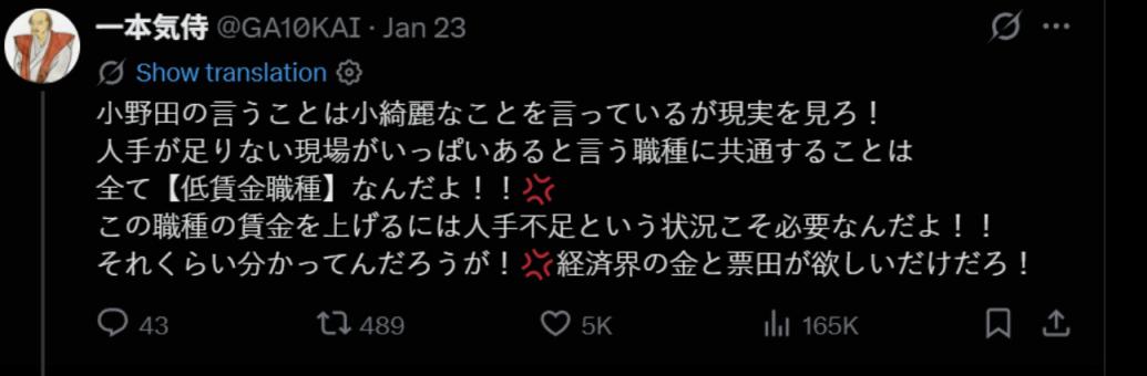从评论区来看,这些右翼民粹分子大多认为小野田是在危言耸听,为自己的不作为找借口。有人认为,小野田之所以认为日本各个行业都离不开外国劳工,是因为日本政府只在乎企业的利益,而企业势必会在日本人和外国劳工之间选择人工成本更低的后者。还有人认为,小野田是在通过强调外国劳工的重要性,回避日本官方是否应向外国劳工及其家人提供补贴等争议性更大的问题。