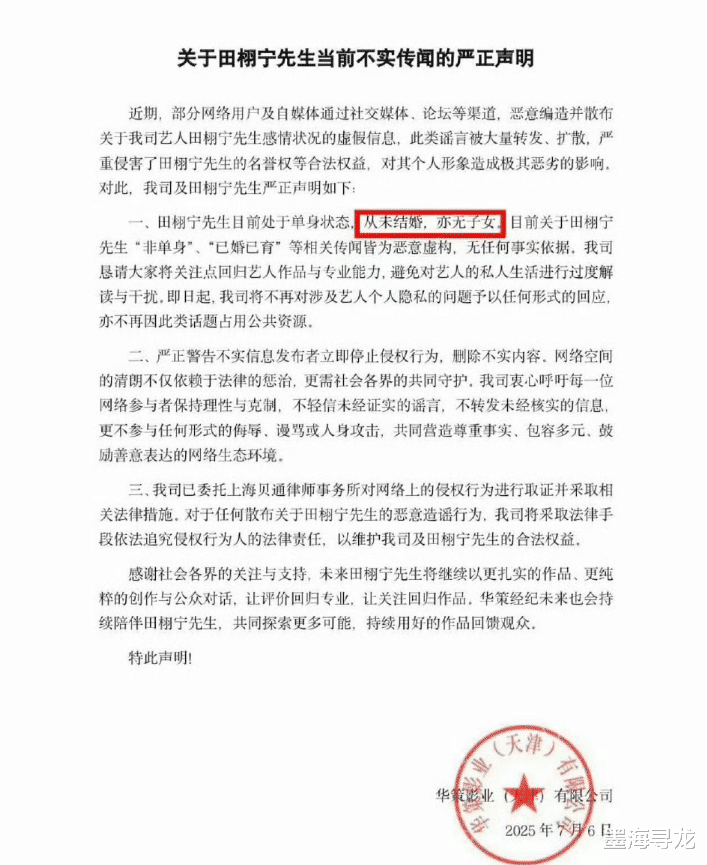 事实上,这并非田栩宁第一次遭受此类别传。2025年6—7月,华策影视及田栩宁本东说念主屡次发布严正声明,明确示意田栩宁独身、未婚、未育,通盘婚育、出轨别传均为坏心虚拟。已固定质问根据,对虚构事实、P图、AI合成本色拿告状讼,讲究法律职守。此前网传“抱娃照”“孕照”均被阐明为合成,无信得过场景与有用凭证。团队强调,此类抹黑已严重骚动艺东说念主名誉权,将一缅怀底。
