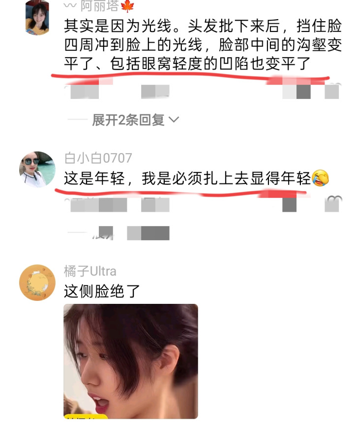 可一朝把头发披下来,碎发和刘海就挡住脸两侧的棱角,让脸部沟壑看起来平整不少,扫数这个词东谈主当然就显得嫩了。