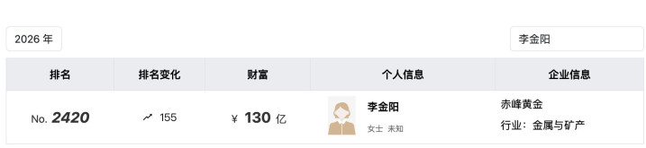 凭据股权结构,赤峰黄金履行适度东说念主李金阳共抓有公司10.02%的股份;烟台瀚丰中兴处治谋划中心(有限合股)抓有赤峰黄金2.71%股份。以最新收盘价钱揣度,其抓股市值约为98.8亿元。凭据胡润预计院暴露的2026年寰球富豪榜,李金阳以130亿资产位列寰球第2420位,名次同比上升155位。