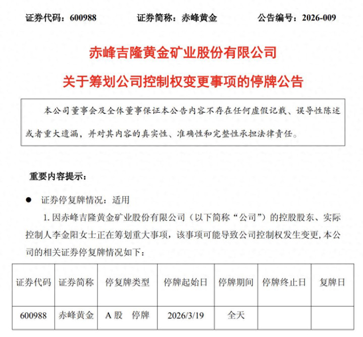 3月19日,赤峰黄金发布公告称,公司于3月18日晚间收到控股鼓动、履行适度东说念主李金阳示知,李金阳十分一致步履东说念主正在蓄意转让所抓公司股份,该事项可能导致公司履行适度东说念主发生变更。
