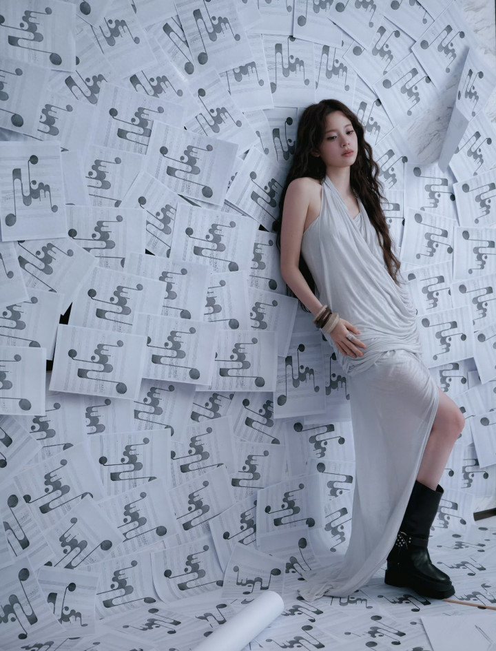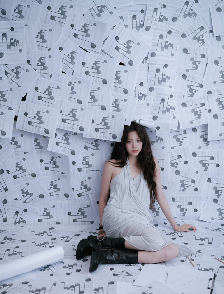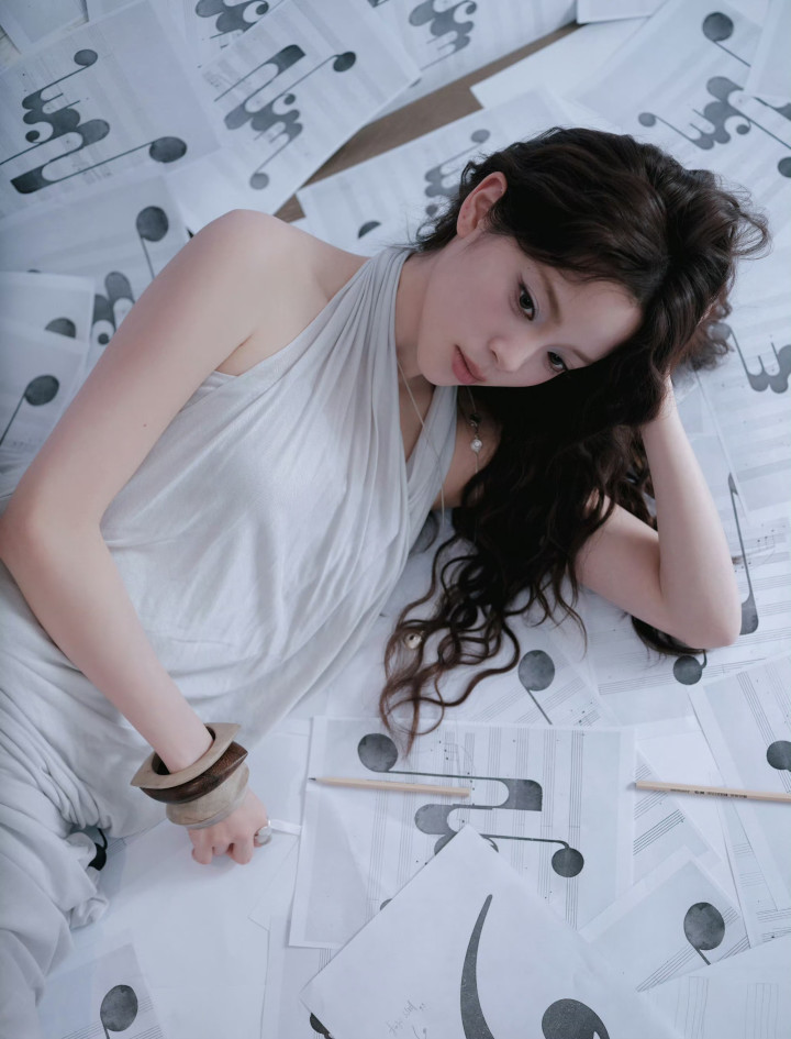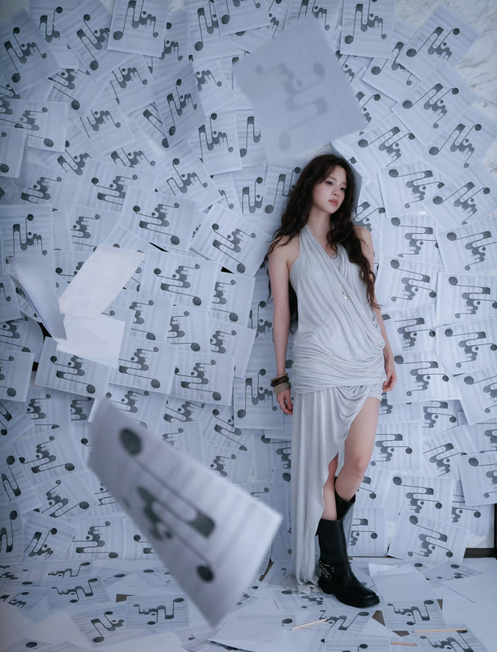 她被满墙的曲谱包裹,仿佛从音符里走出来的青娥。浅灰色的挂脖长裙垂坠又随心,玄色厚底靴中庸了秀气,显涌现大致的酷感。