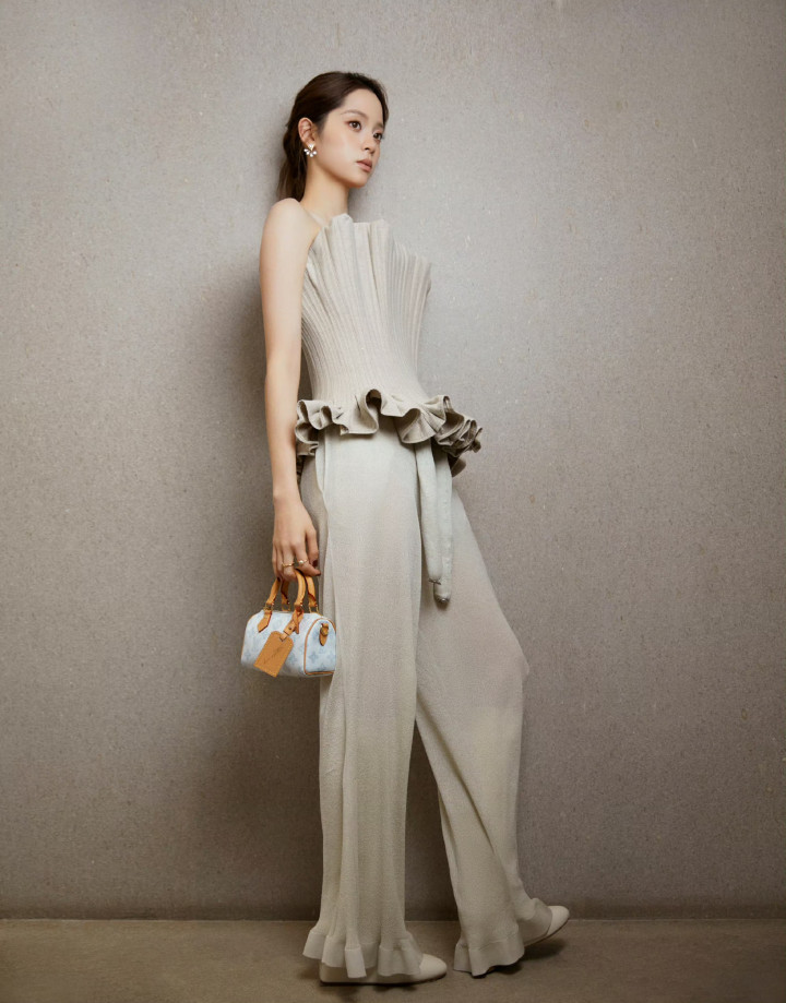 穿起浅杏色的抹胸套装,上半身的竖纹竭诚牢牢包裹,线条利落又暖热,腰侧的荷叶边像格外的音符,中庸了合座的硬朗。