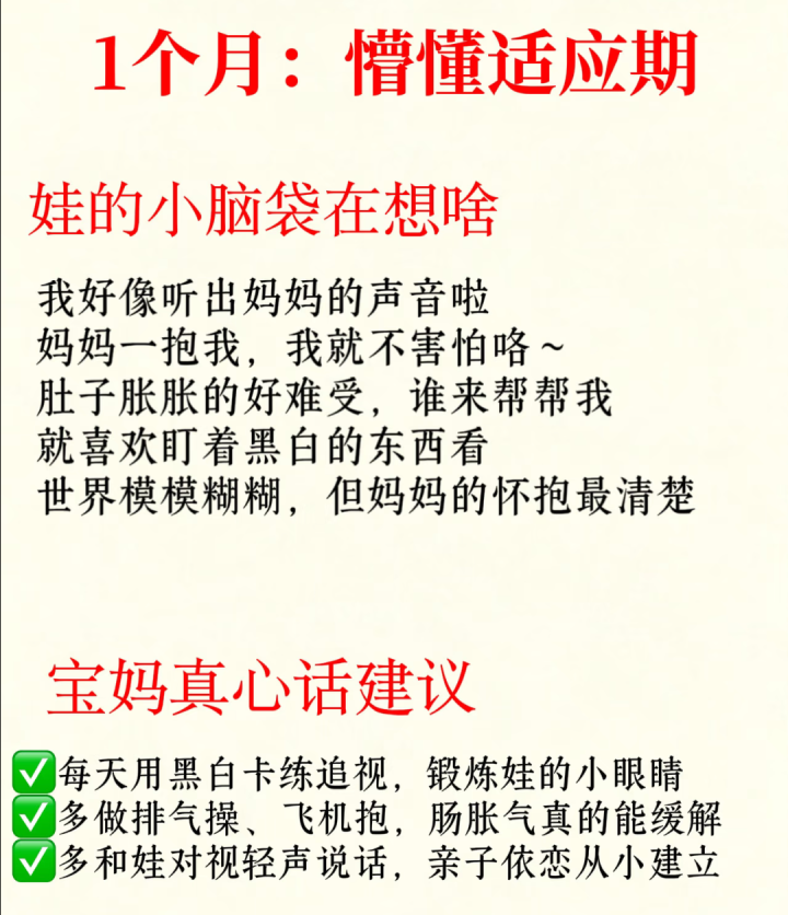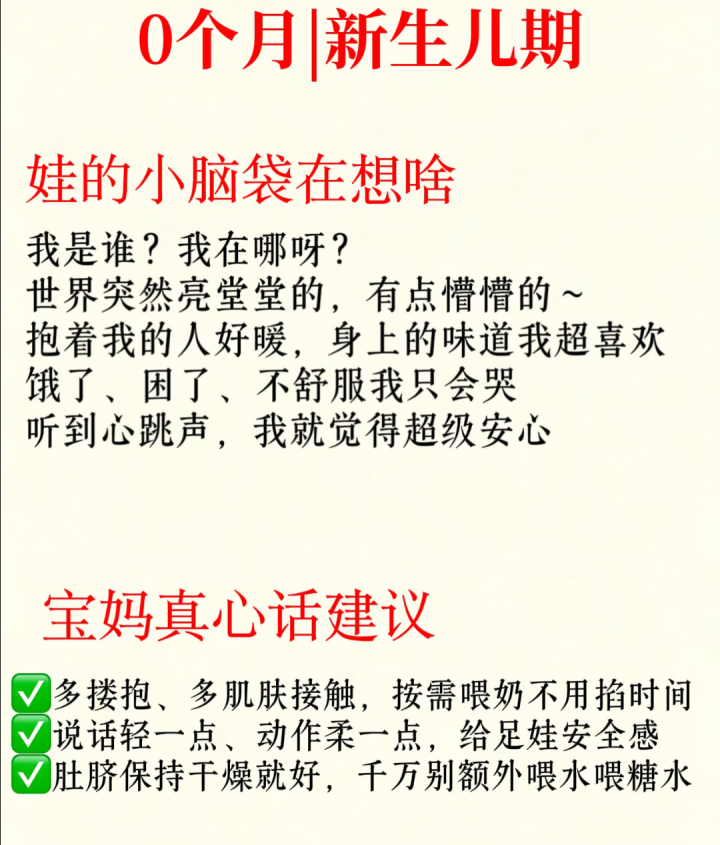 刚降生的小婴儿,看起来除了吃即是睡,其实他们的小脑袋瓜里装满了清新事。第一个月,宝宝最大的隐衷即是“我好窄小”。片刻离开仁和闇练的子宫,来到这个又亮又吵的全国,每一次被放下、每一个生分的声息齐会让他焦急失措。他只思贴在姆妈怀里,听阿谁闇练的心跳声,这是他对安全感通盘的清爽。