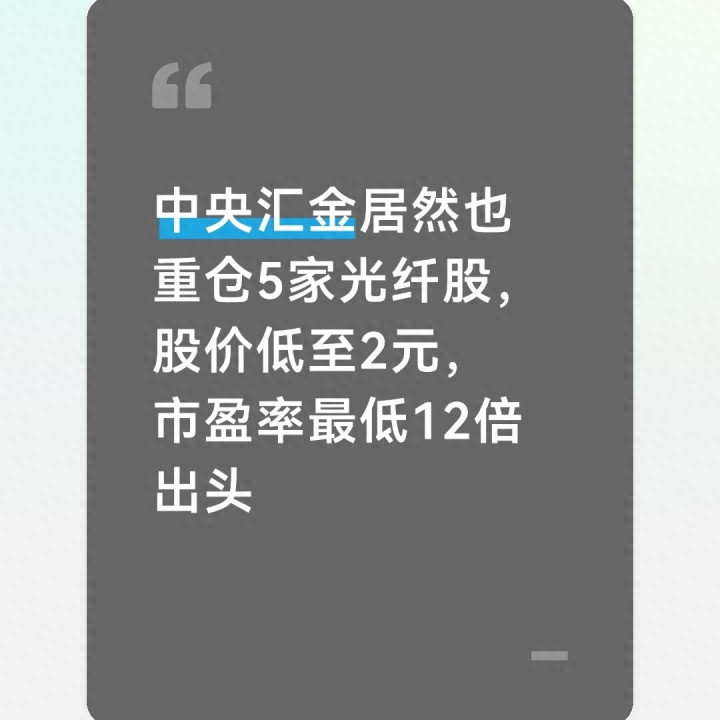近期A股阛阓里,有一个信号格外值得护理——素有“国度队风向标”之称的中央汇金,悄然重仓布局了5家光纤赛说念上市公司。更让东说念主无意的是,这批标的普遍股价偏低,最低仅2元出面,市盈率也处于低位,最低一家不外12倍出面。